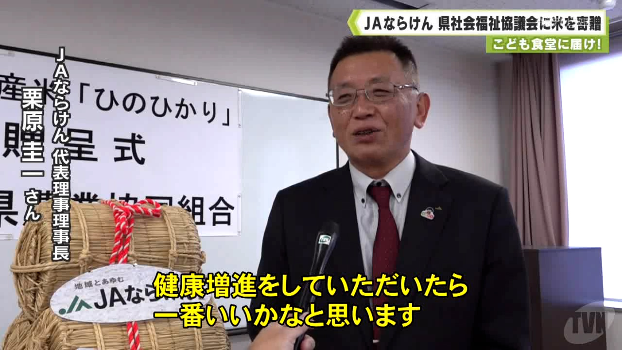 JAならけんが、こども食堂の活動に役立ててもらおうと、県社会福祉協議会に県産の「ヒノヒカリ」を贈りました。