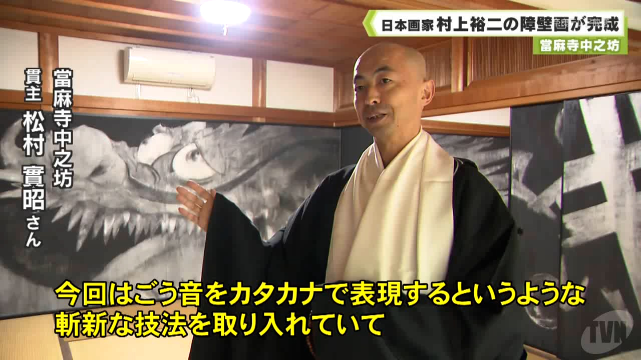 - ゴジラやウルトラマンなどをモチーフに描いた、日本画で知られる村上裕二さんにより、葛城市の當麻寺中之坊で進められていた障壁画の制作が、このほど完成し、報道陣に公開されました。