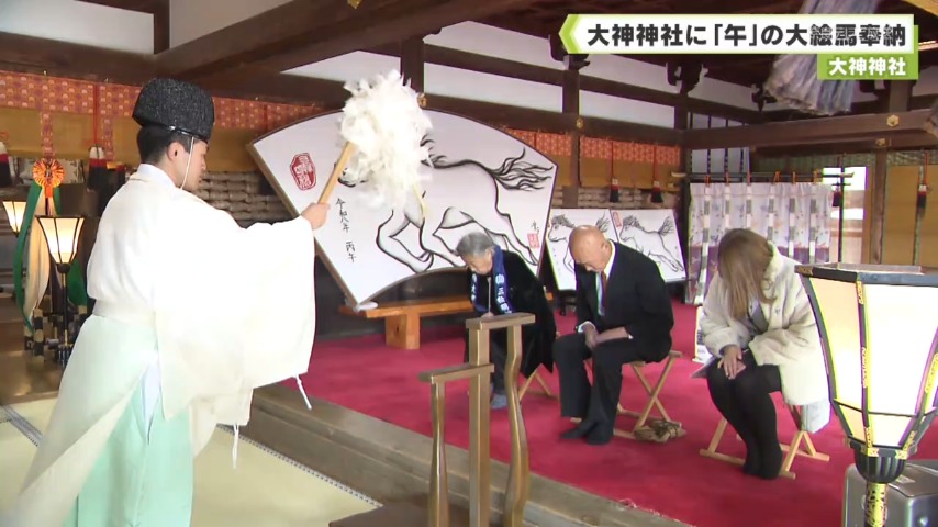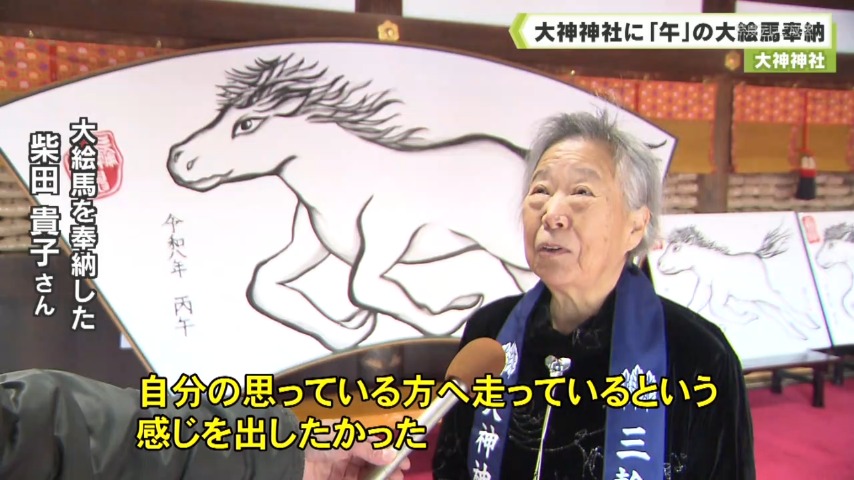 - 初詣の参拝者を出迎える巨大な絵馬。大神神社の拝殿では、大絵馬を神前に供え、奉納されたことを報告する祭りが行われました。大絵馬は高さ約1.5メートル幅約4メートルで、飛ぶように走る馬が描かれています。手掛けたのは田原本町在住の洋画家・柴田貴子さん。2004年から毎年奉納していて、今回で23回目となります。