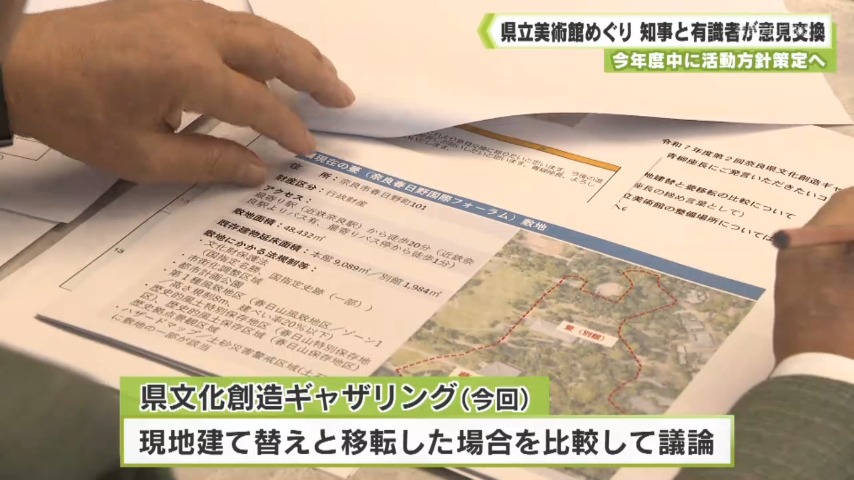 - 1973年に開館した県立美術館は、絵画や工芸、彫刻など約4100点を所蔵していますが、建物の老朽化が課題となっています。これまでの会議では、県庁の近くにある県立美術館を奈良公園内にある「奈良春日野国際フォーラム甍」に移転する案が出されていて、17日は、現地建て替えと移転した場合を比較して意見が交わされました。