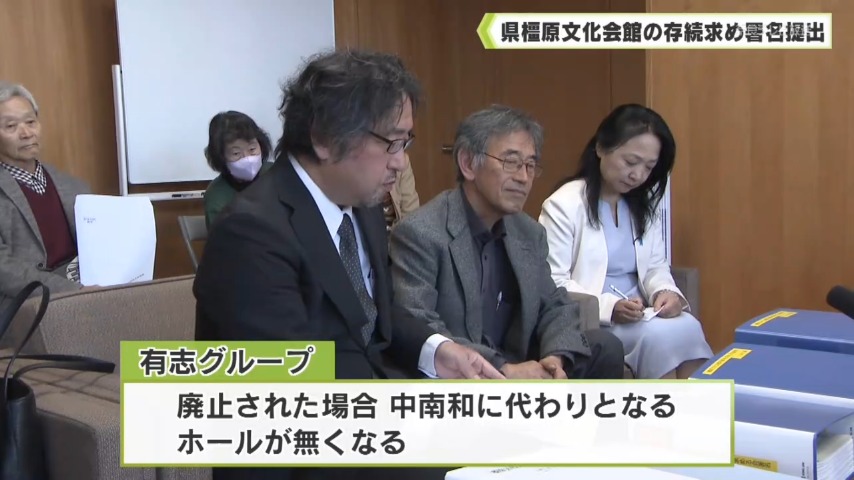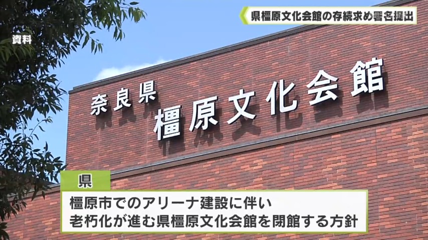 - 県が廃止の方針を示している県橿原文化会館の存続を求めて、有志のグループがのべ42000人あまりの署名を、山下知事あてに提出しました。