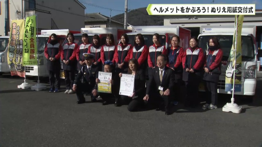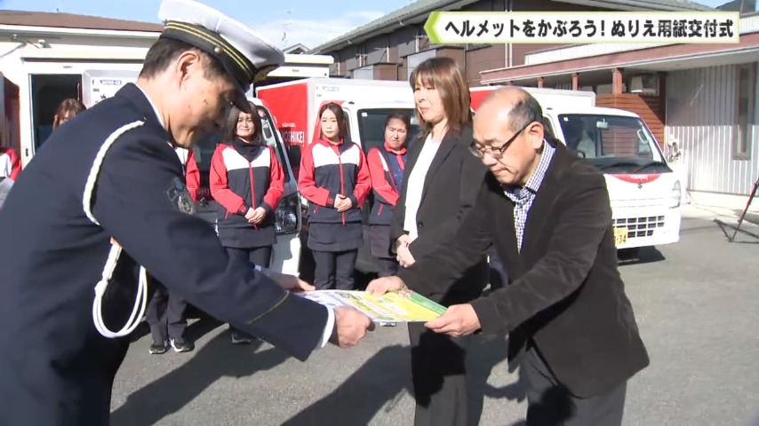 - ヨシケイライブリー生駒営業所では、幅広い世代の自転車の利用者にヘルメット着用をしてもらおうと、生駒市と警察などが主催する塗り絵コンテストに協賛しています。17日行われた交付式では、生駒警察署の中西輝彦署長らから、コンテスト応募用紙がヨシケイライブリーの社員に手渡されました。
