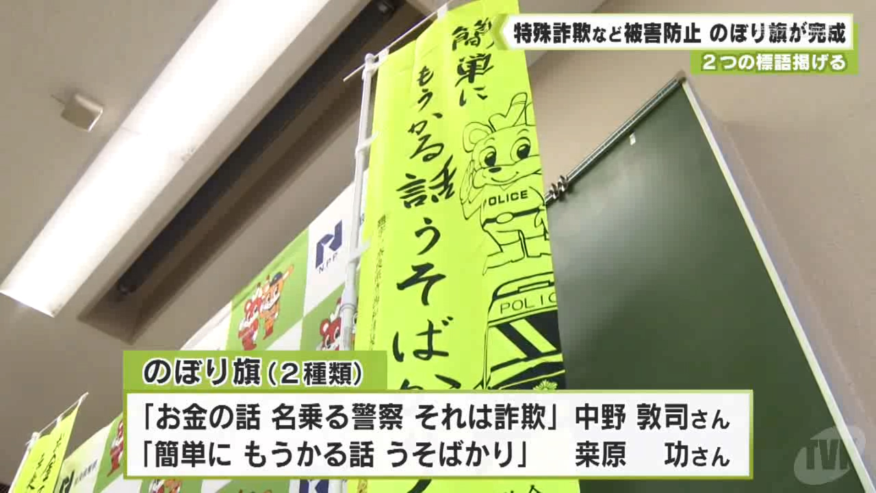 2つの標語掲げる 特殊詐欺など被害防止 のぼり旗が完成