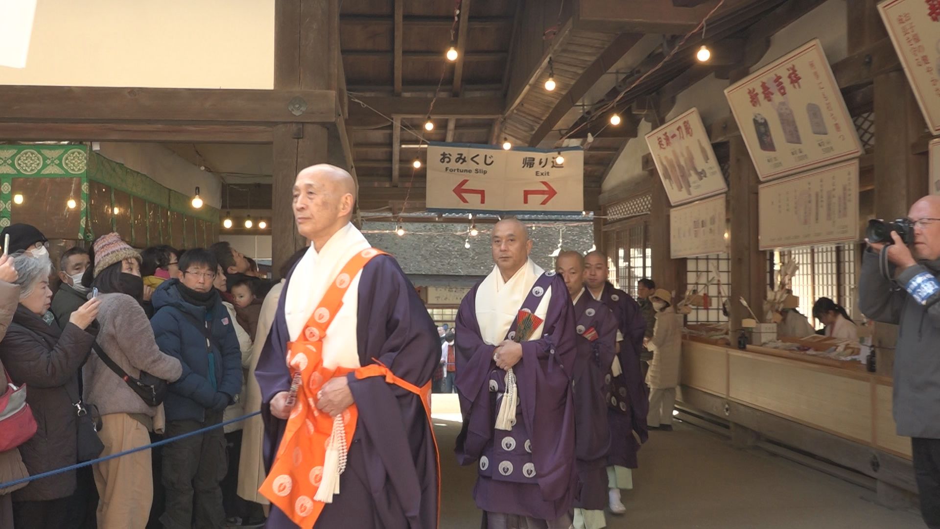 一行はそのあと、境内にある若宮神社に移動し、僧侶は神前で般若心経を唱えました。さらに、「珍らしな」という名がつけられた神楽が舞われ、参列者は2026年の国家の安寧と繁栄を祈りました。