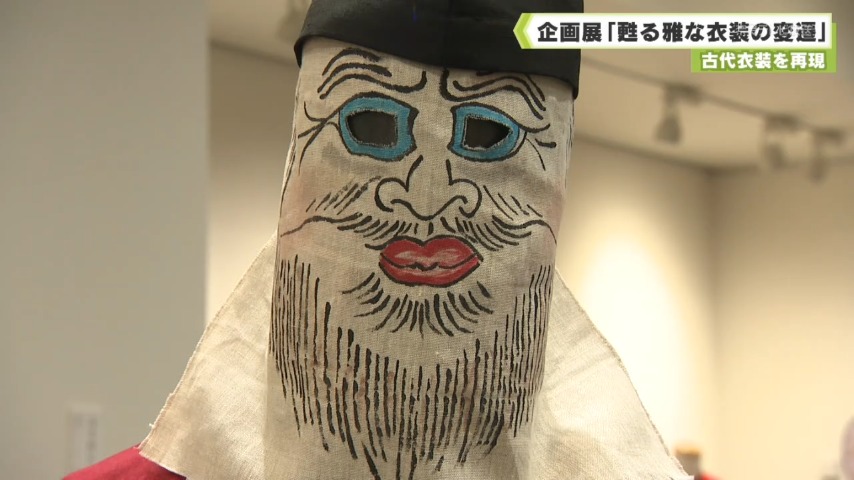 山口さんは、高松塚古墳などの壁画や、文献、正倉院に伝わる宝物などを参考に衣装を制作したといい、中でも、こちらの伎楽衣装(ぎがくいしょう)を展示するのは今回が初めてです。