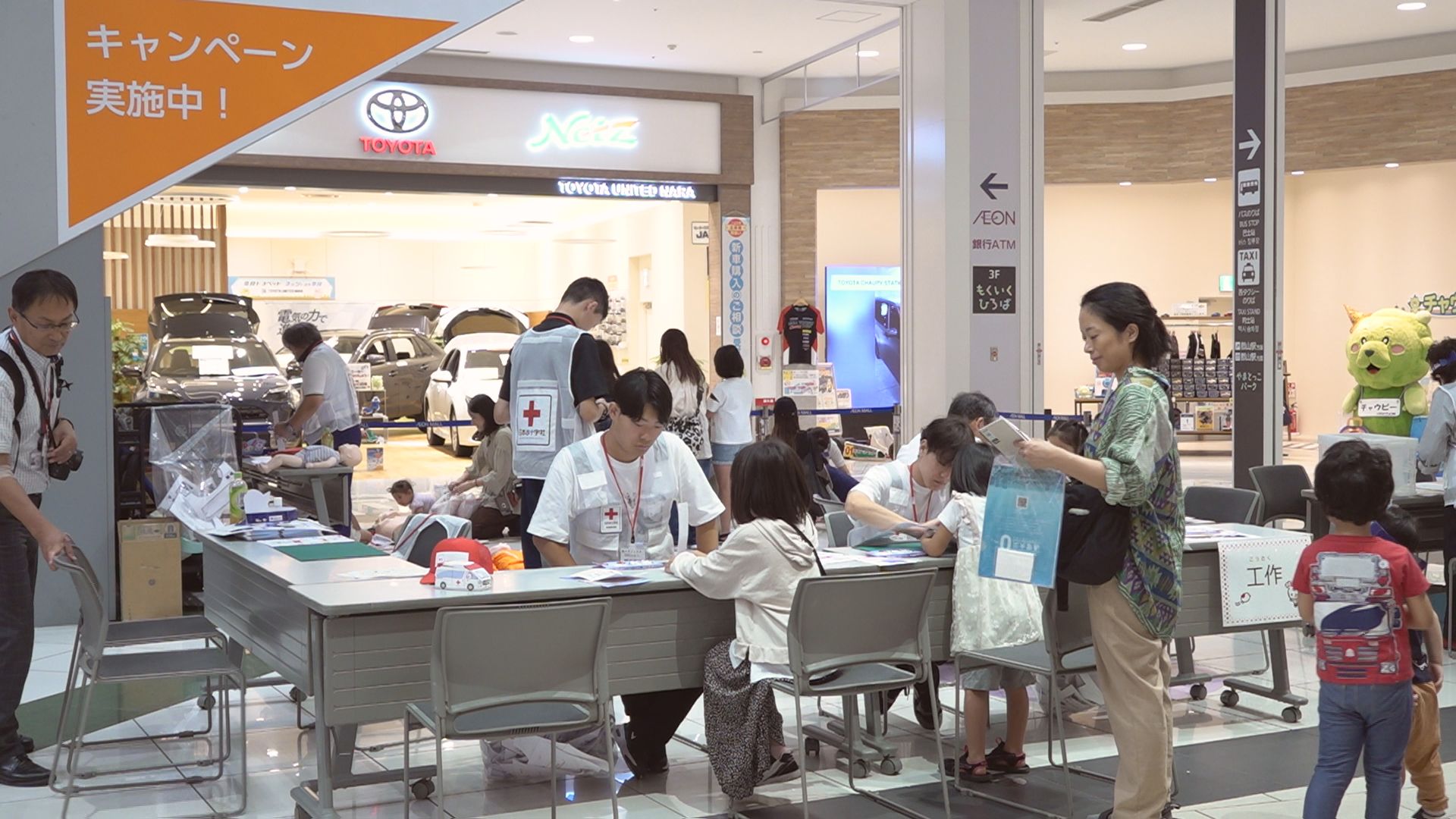- マスコットキャラクターのけんけつちゃんらも登場した日本赤十字社のブースでは、AEDの講習会が開かれました。