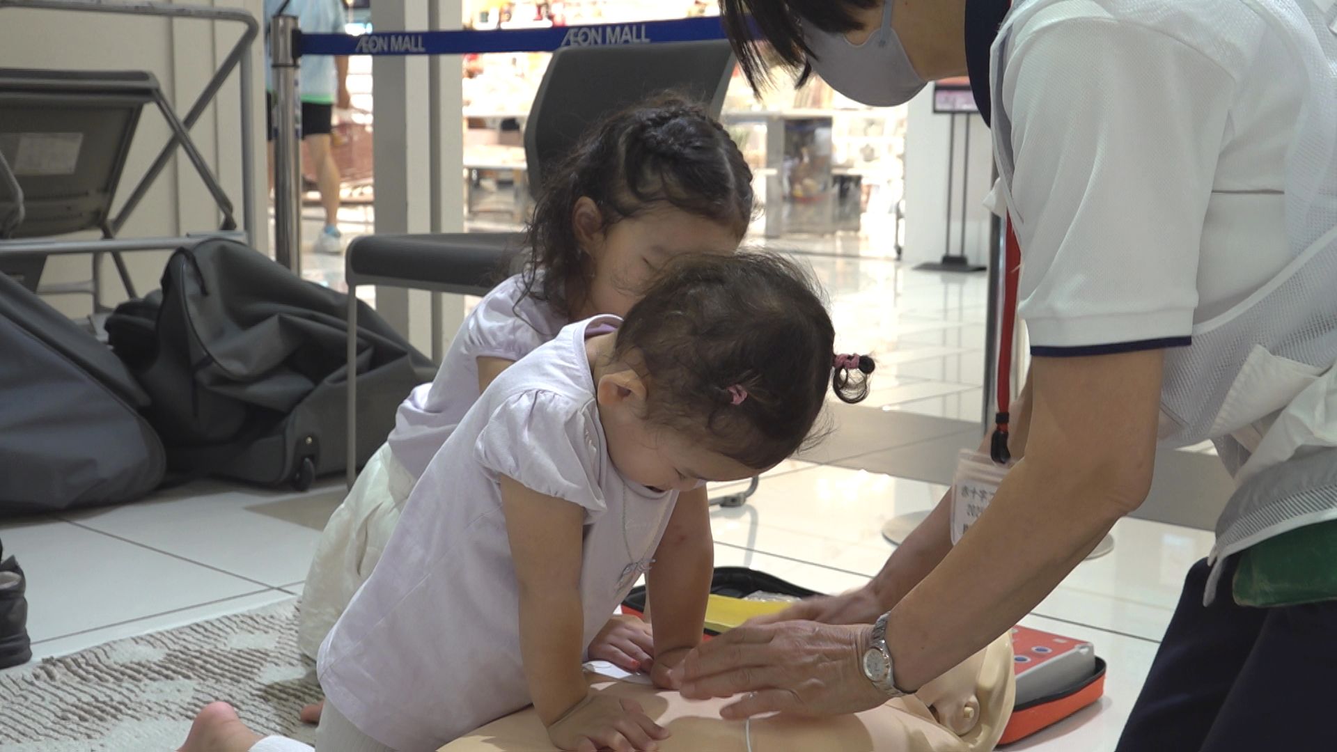 - 子どもたちは真剣に説明を聞いた後、胸の押す位置や深さを確認しながら心肺蘇生を練習していました。