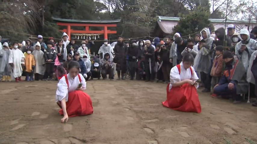 しめ縄が張り巡らされ田んぼに見立てられた拝殿前では、太鼓の合図で装束を着けた田人(たびと)が田植えの準備をした後、手に持ったすきで参拝者に砂をかけます。