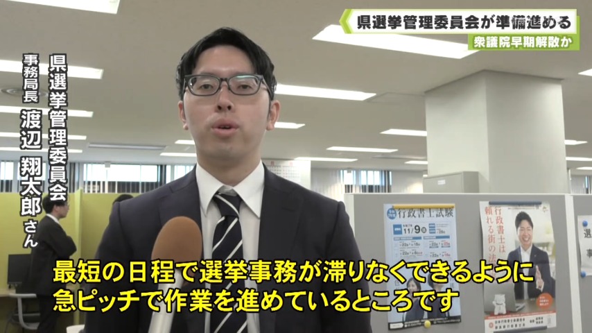 「最短の日程で選挙事務が滞りなく出来るように、急ピッチで作業を進めているところです。かなりタイトなスケジュールが想定されますので、市町村の選挙管理委員会とも良く連携をしながら、滞りなく選挙事務を執行できるようにしていきたいと思っています」