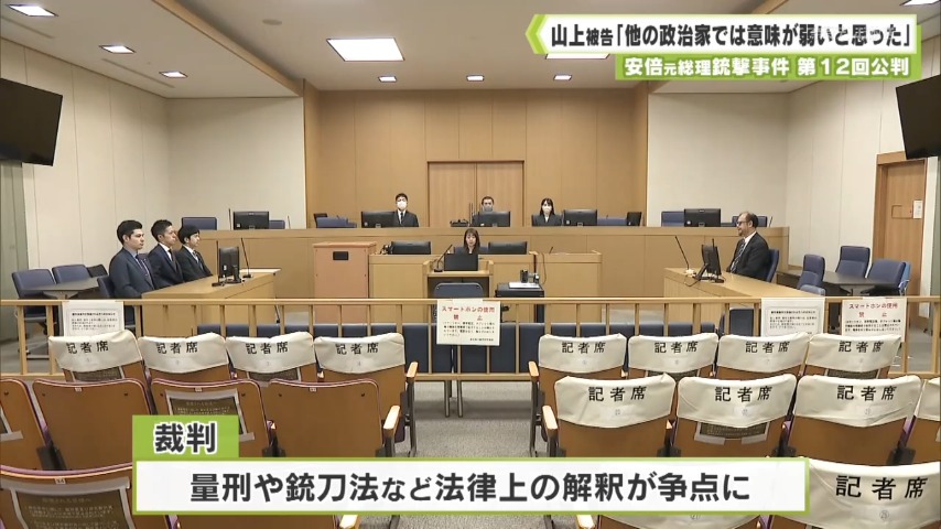 - 安倍元総理銃撃事件で殺人などの罪に問われている山上徹也被告の第12回公判が開かれ、山上被告は、銃撃の理由について「他の政治家では意味が弱いと思った」と述べました。