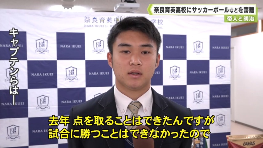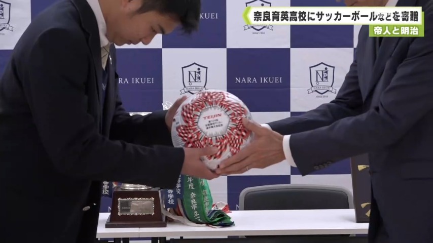 全国高校サッカー選手権大会に協賛する帝人株式会社と株式会社明治が、奈良育英高校にサッカーボールなどを寄贈しました。