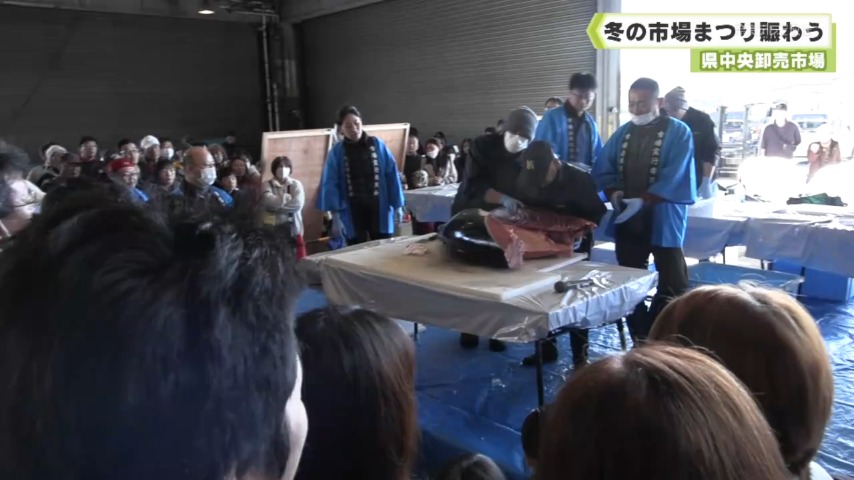 - さらにせりを体験する催しも開かれ、参加した人が競り落とした品物を購入したほか、マグロの解体ショーなどもあり「冬の市場まつり」は多くの人で賑っていました。