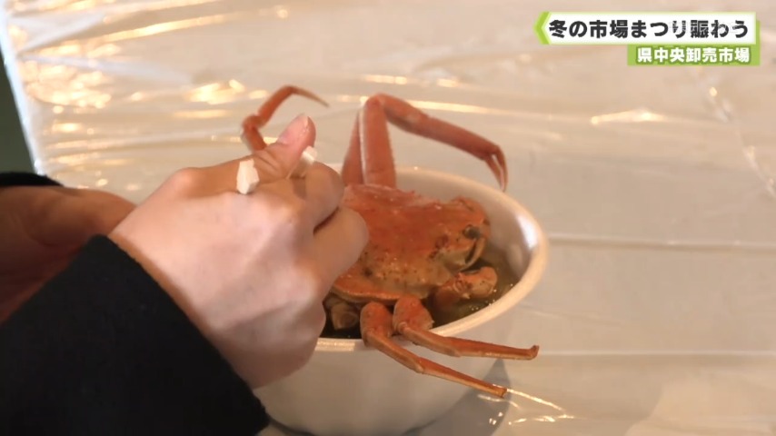 - 市場まつりは、県民の台所としての役割を担う県中央卸売市場を、広く知ってもらおうと開かれているもので、旬の野菜などがお得な価格で販売されたほか、カニを丸ごと一匹使った「かに鍋」や学生が考えたメニューなども登場し、訪れた人は買い物とグルメを満喫していました。