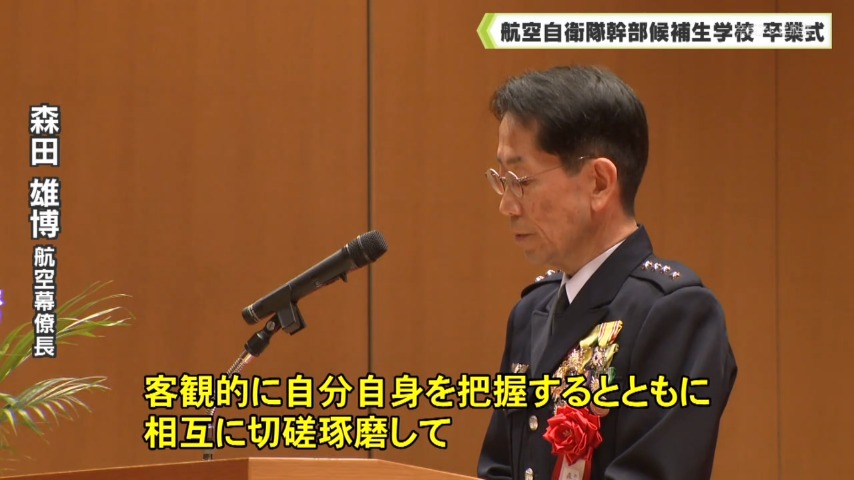 式では、修了証書が一人ずつ手渡されたあと、加藤康博学校長が「不安に打ち勝ち、空を見上げ、爽やかに部隊に赴任し、この先の任務にまい進してくれることを心から祈念しています」などと、式辞を述べました。