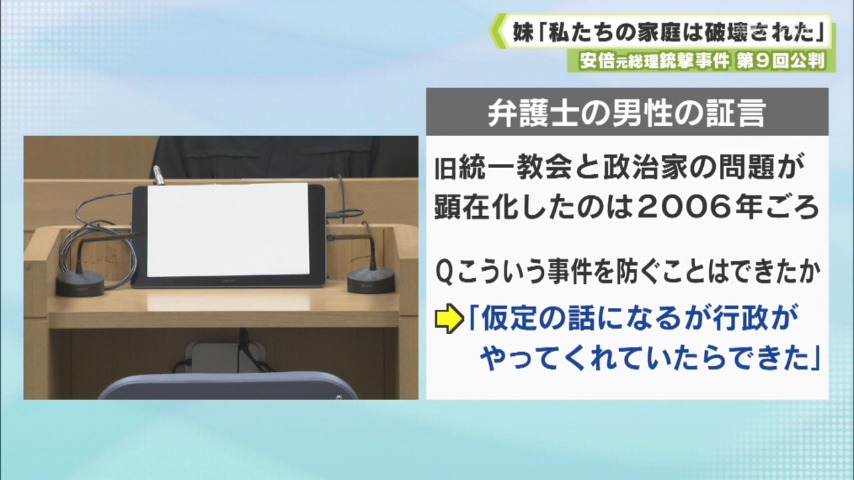 この後、霊感商法の救済にあたる弁護士の男性が出廷しました。男性は、旧統一教会と政治家の関係が顕在化したのは2006年頃だと話しました。また、こういう事件を防ぐことはできたかという弁護側の質問に対し、「仮定の話になるが行政がやってくれていたらできた」と述べました。