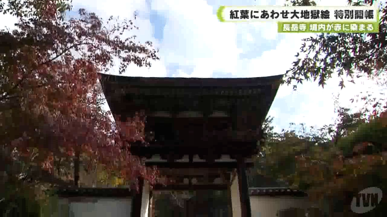 長岳寺 境内が朱に染まる 紅葉にあわせ大地獄絵 特別開帳